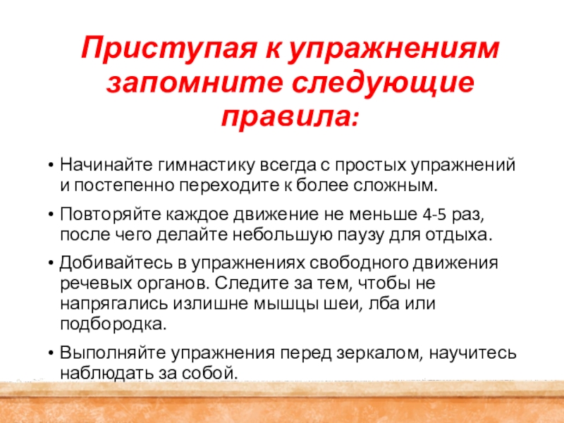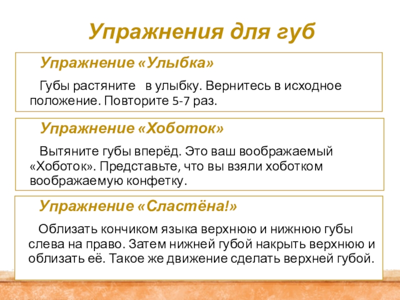 Облизать кончиком языка верхнюю и нижнюю губы слева на право. Затем нижней губой накрыть верхнюю и облизать её. Такое же движение сделать верхней губой.