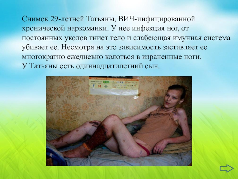 Слайд 14Снимок 29-летней Татьяны, ВИЧ-инфицированной хронической наркоманки. У нее инфекция ног, от