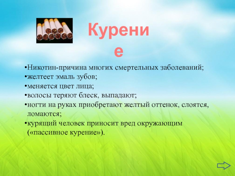КурениеНикотин-причина многих смертельных заболеваний;желтеет эмаль зубов;меняется цвет лица;волосы теряют блеск, выпадают;ногти на руках приобретают желтый оттенок, слоятся,