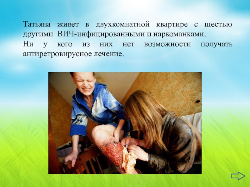 Слайд 15Татьяна живет в двухкомнатной квартире с шестью другими ВИЧ-инфицированными и наркоманками.