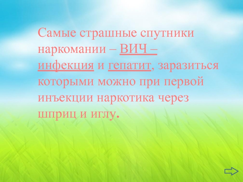 Слайд 12Самые страшные спутники наркомании – ВИЧ – инфекция и гепатит, заразиться которыми можно при