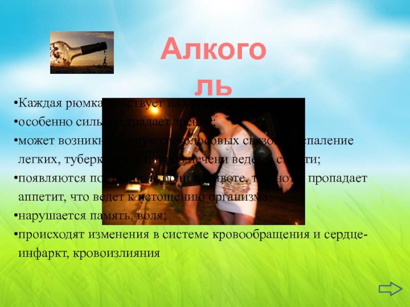 АлкогольКаждая рюмка действует на организм, как яд;особенно сильно страдает зрение;может возникнуть опухоль голосовых связок, воспаление легких, туберкулез,