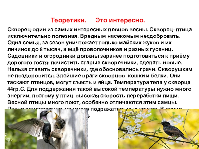 Скворец-один из самых интересных певцов весны. Скворец- птица исключительно полезная. Вредным насекомым несдобровать. Одна семья, за сезон уничтожает только майских жуков и их личинок до 8 тысяч, а ещё проволочников и разных гусениц. Садовники и огородники должны заранее подготовиться к приёму дорогого гостя: почистить старые скворечники, сделать новые. Нельзя ставить скворечники, где обосновались грачи. Скворушкам не поздоровится. Злейшие враги скворцов- кошки и белки. Они таскают птенцов, могут съесть и яйца. Температура тела у скворца 44гр.С. Для поддержания такой высокой температуры нужно много энергии, поэтому у птиц высокая скорость переработки пищи. Весной птицы много поют, особенно отличаются этим самцы. Песня односложная, но много подражательных звуков. В пении скворца слышны голоса птиц.