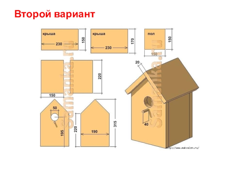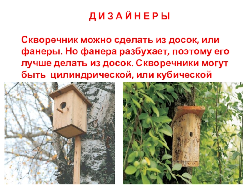 Скворечник можно сделать из досок, или фанеры. Но фанера разбухает, поэтому его лучше делать из досок. Скворечники могут быть цилиндрической, или кубической формы.