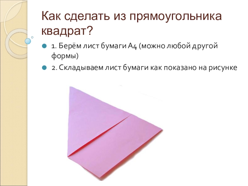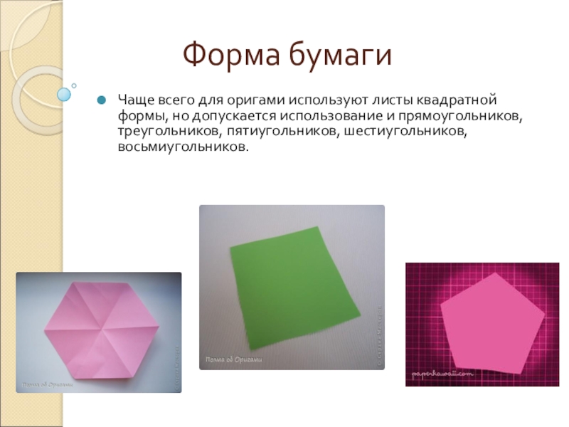 оригами используют листы квадратной формы, но допускается использование и прямоугольников, треугольников, пятиугольников, шестиугольников, восьмиугольников.