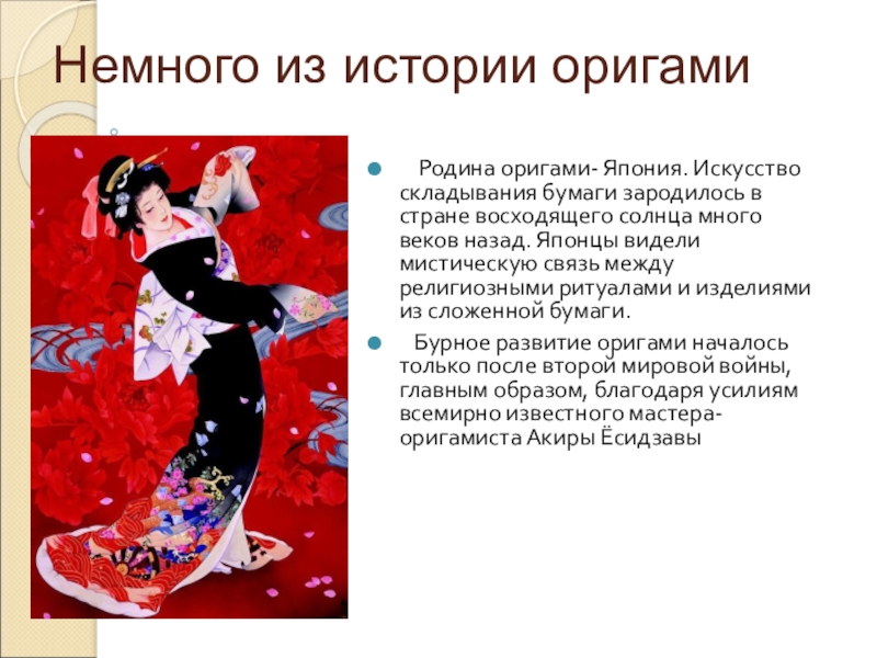 зародилось в стране восходящего солнца много веков назад. Японцы видели мистическую связь между религиозными ритуалами и изделиями из сложенной бумаги.