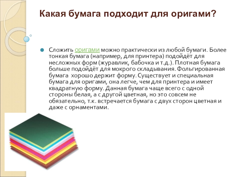 Более тонкая бумага (например, для принтера) подойдёт для несложных форм (журавлик, бабочка и т.д.). Плотная бумага больше подойдёт для мокрого складывания. Фольгированная бумага хорошо держит форму. Существует и специальная бумага для оригами, она легче, чем для принтера и имеет квадратную форму. Данная бумага чаще всего с одной стороны белая, а с другой цветная, но это совсем не обязательно, т.к. встречается бумага с двух сторон цветная и даже с орнаментами.