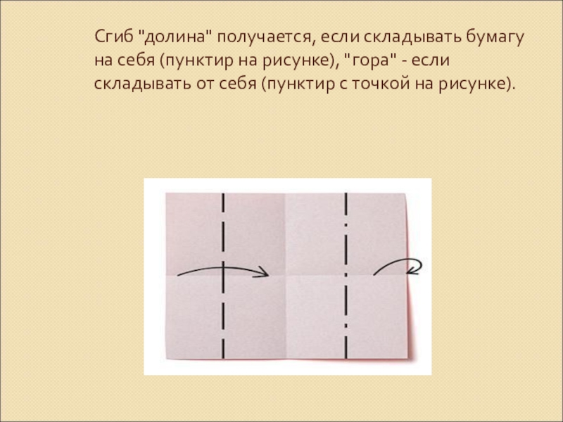 Слайд 8Сгиб "долина" получается, если складывать бумагу на себя (пунктир на рисунке),