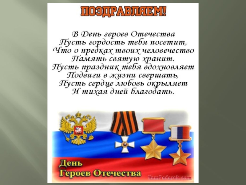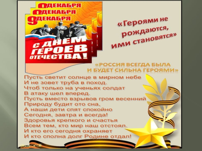 9 декабря отмечается День Героев Отечества.В этот день чествуют Героев Советского Союза, Героев Российской Федерации, кавалеров ордена Святого Георгия и ордена Славы.