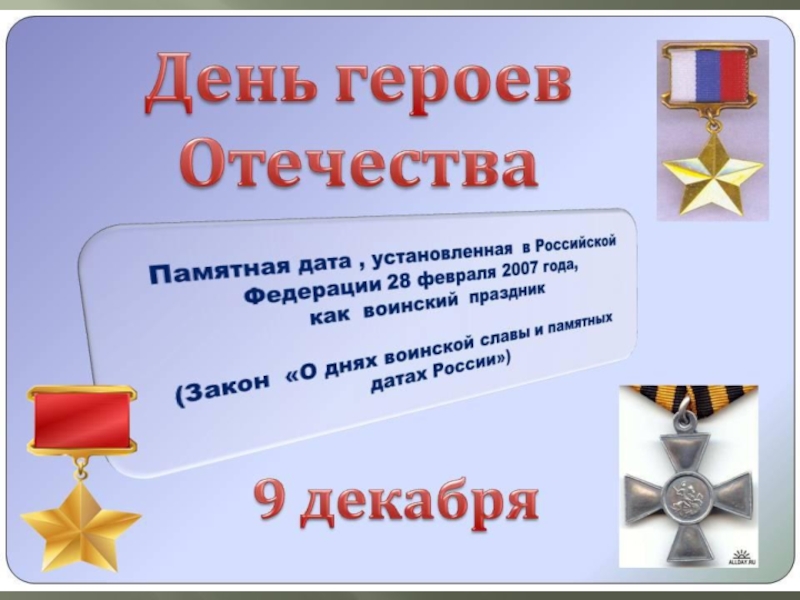 9 декабря отмечается День Героев Отечества.В этот день чествуют Героев Советского Союза, Героев Российской Федерации, кавалеров ордена