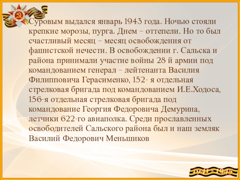 – оттепели. Но то был счастливый месяц – месяц освобождения от фашистской нечести. В освобождении г. Сальска и района принимали участие войны 28 й армии под командованием генерал – лейтенанта Василия Филипповича Герасименко, 152- я отдельная стрелковая бригада под командованием И.Е.Ходоса, 156-я отдельная стрелковая бригада под командование Георгия Федоровича Демурина, летчики 622-го авиаполка. Среди прославленных освободителей Сальского района был и наш земляк Василий Федорович Меньшиков