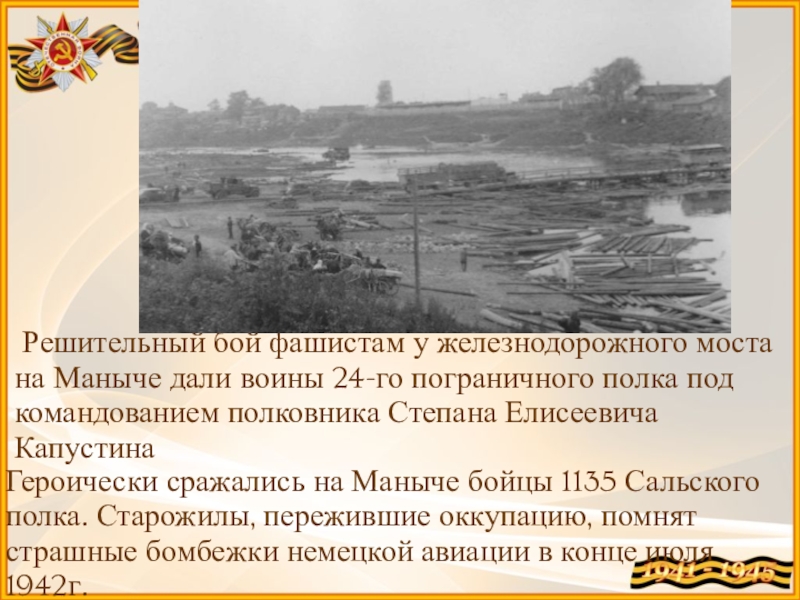 Слайд 12Героически сражались на Маныче бойцы 1135 Сальского полка. Старожилы, пережившие оккупацию,