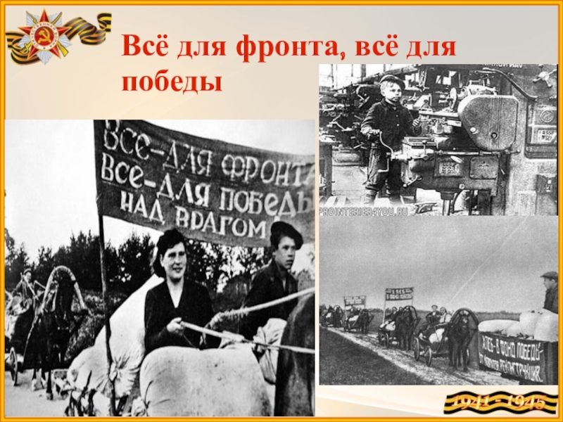 чувства и настроения проявились не только в массовом героизме советских солдат на фронте, но и в тылу. Лозунги "В тылу, как на фронте!", "Все для фронта, все для победы!" стали руководством к действию.