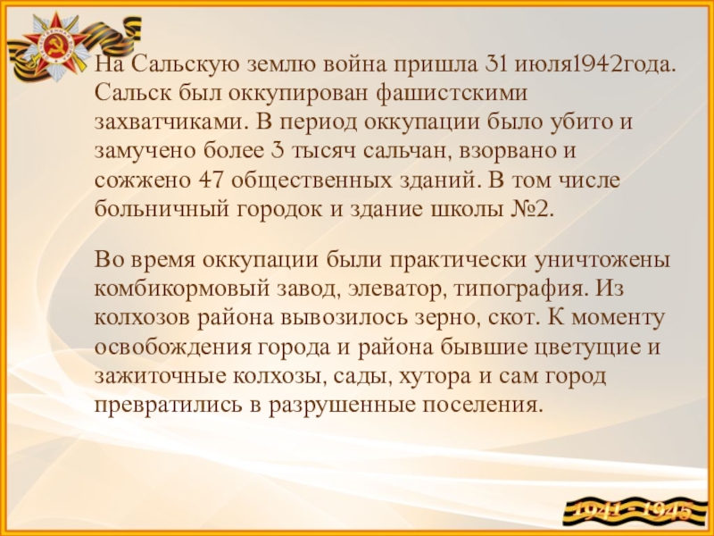 Слайд 3На Сальскую землю война пришла 31 июля1942года. Сальск был оккупирован фашистскими