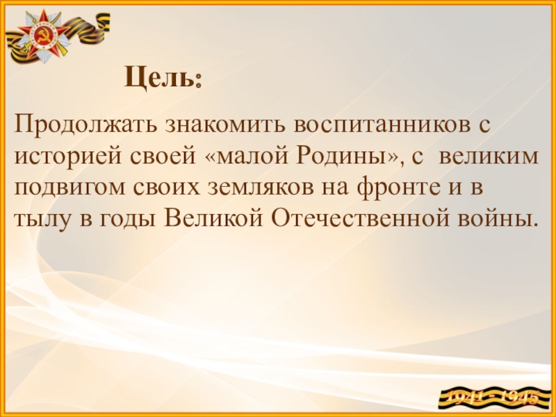 Продолжать знакомить воспитанников с историей своей «малой Родины», с великим подвигом