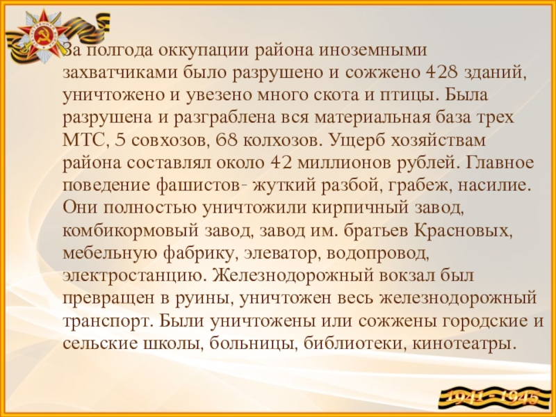 зданий, уничтожено и увезено много скота и птицы. Была разрушена и разграблена вся материальная база трех МТС, 5 совхозов, 68 колхозов. Ущерб хозяйствам района составлял около 42 миллионов рублей. Главное поведение фашистов- жуткий разбой, грабеж, насилие. Они полностью уничтожили кирпичный завод, комбикормовый завод, завод им. братьев Красновых, мебельную фабрику, элеватор, водопровод, электростанцию. Железнодорожный вокзал был превращен в руины, уничтожен весь железнодорожный транспорт. Были уничтожены или сожжены городские и сельские школы, больницы, библиотеки, кинотеатры.