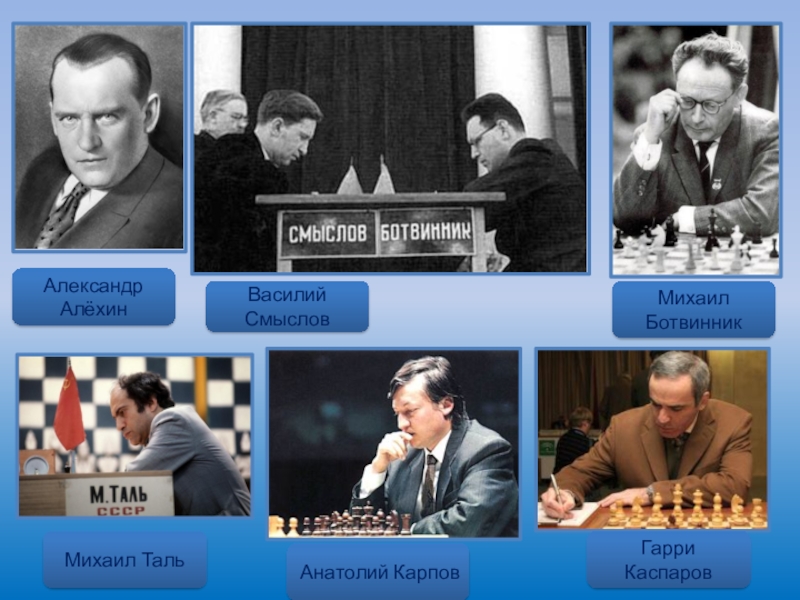 Михаил БотвинникАнатолий КарповГарри КаспаровАлександр АлёхинВасилий СмысловМихаил Таль