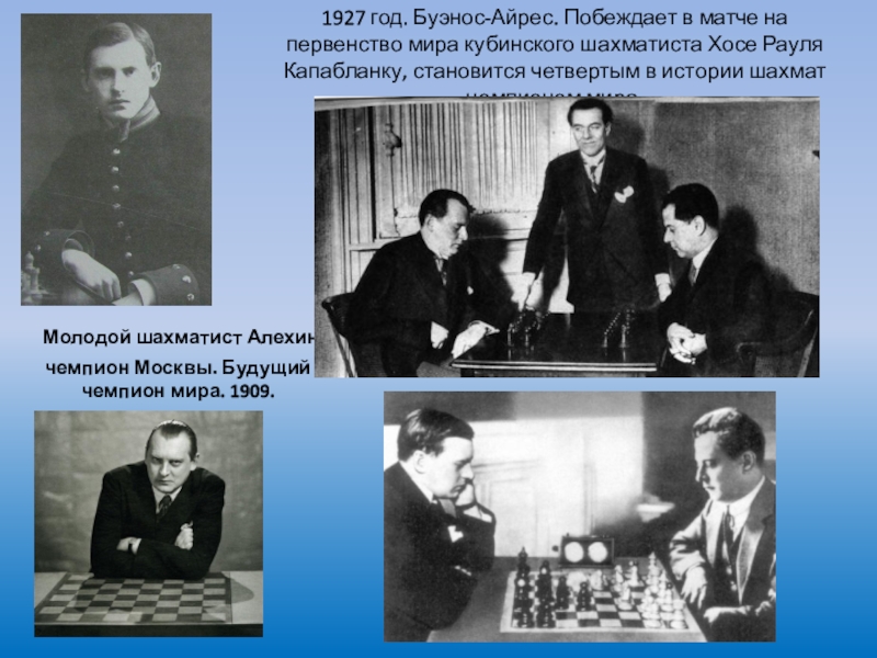 Молодой шахматист Алехин, чемпион Москвы. Будущий чемпион мира. 1909.1927 год. Буэнос-Айрес. Побеждает в матче на первенство мира