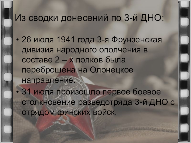Из сводки донесений по 3-й ДНО:26 июля 1941 года 3-я Фрунзенская дивизия народного ополчения в составе 2