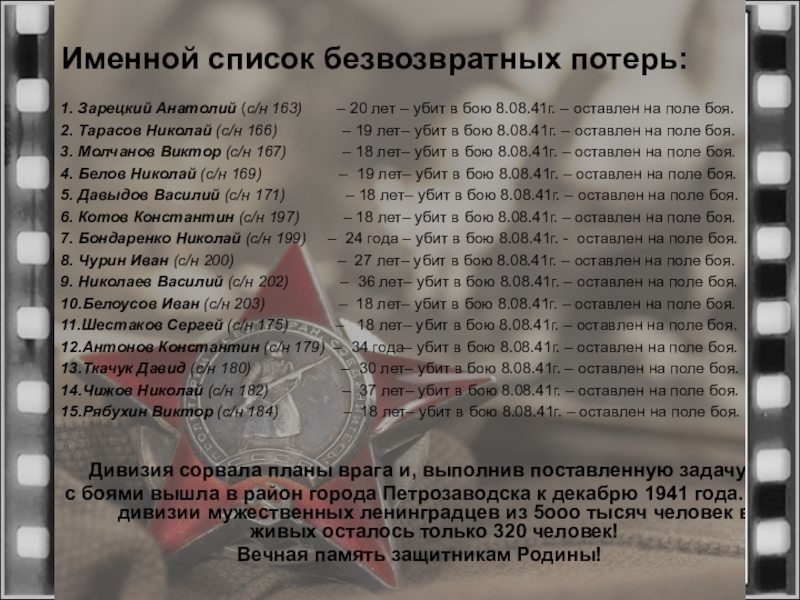 Именной список безвозвратных потерь: 1. Зарецкий Анатолий (с/н 163)    – 20 лет – убит