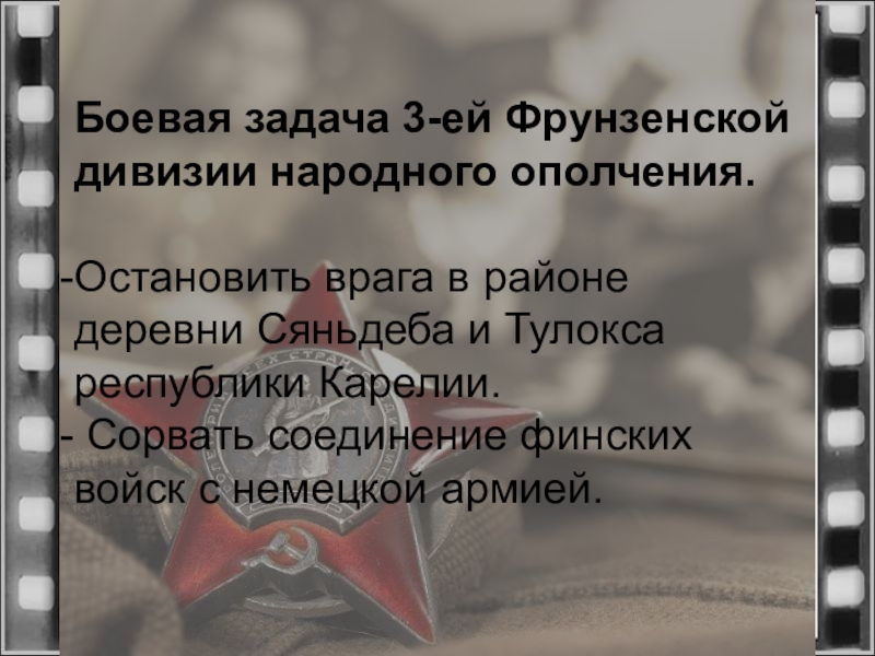 Боевая задача 3-ей Фрунзенской дивизии народного ополчения.Остановить врага в районе деревни Сяньдеба и Тулокса республики Карелии. Сорвать