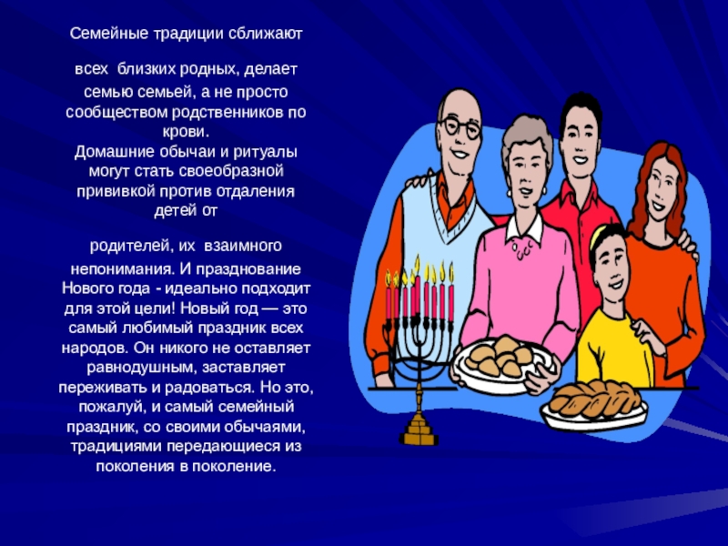 родителей, их взаимного непонимания. И празднование Нового года - идеально подходит для этой цели! Новый год — это самый любимый праздник всех народов. Он никого не оставляет равнодушным, заставляет переживать и радоваться. Но это, пожалуй, и самый семейный праздник, со своими обычаями, традициями передающиеся из поколения в поколение.