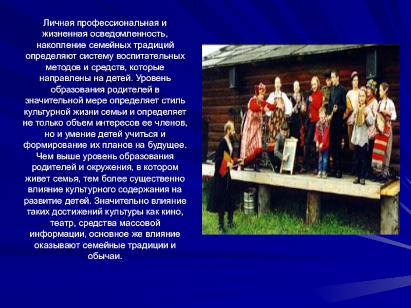 Слайд 3Личная профессиональная и жизненная осведомленность, накопление семейных традиций определяют систему воспитательных