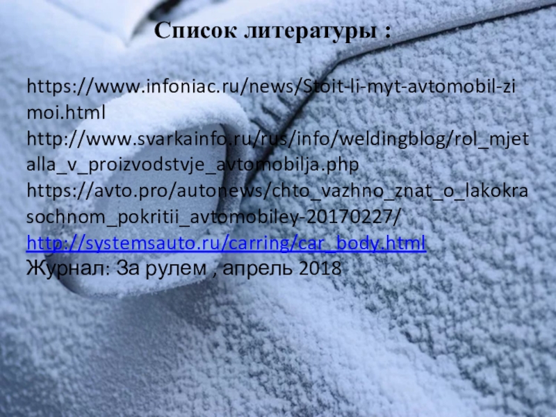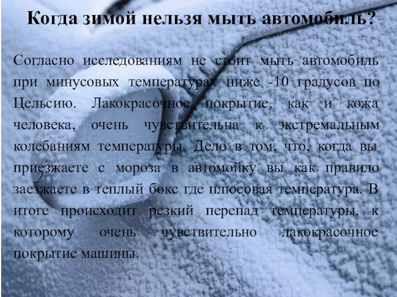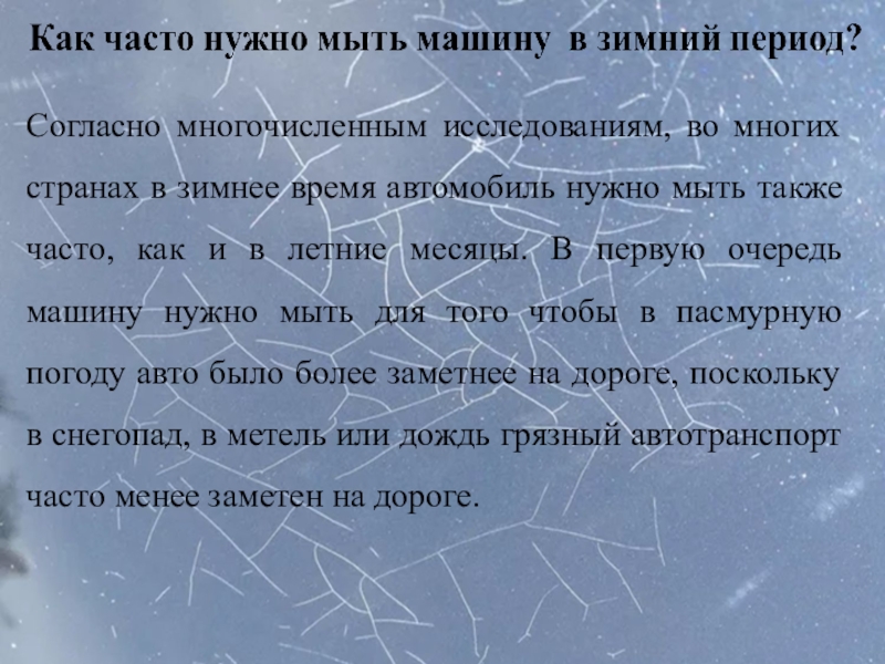 Согласно многочисленным исследованиям, во многих странах в зимнее время автомобиль нужно мыть также часто, как и в летние месяцы. В первую очередь машину нужно мыть для того чтобы в пасмурную погоду авто было более заметнее на дороге, поскольку в снегопад, в метель или дождь грязный автотранспорт часто менее заметен на дороге.
