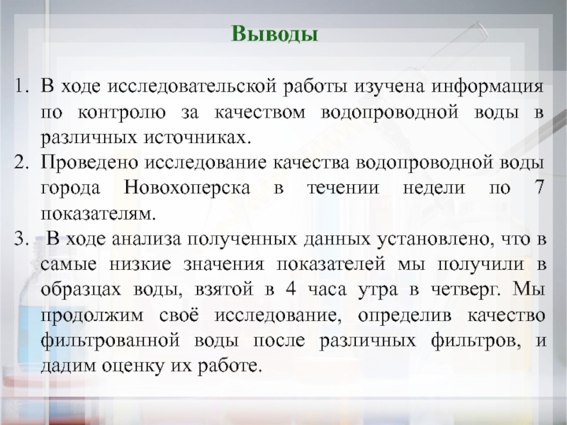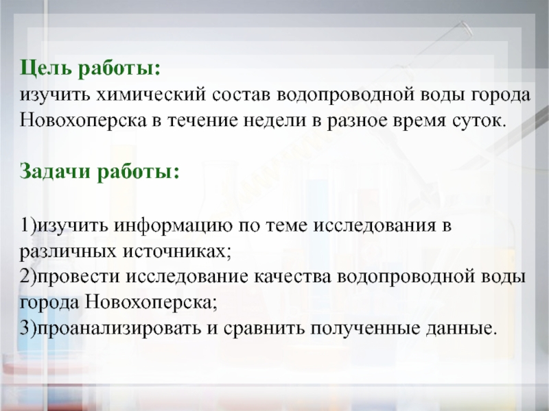 2)провести исследование качества водопроводной воды города Новохоперска;