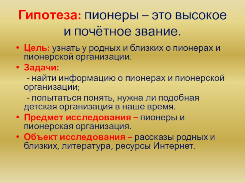 Гипотеза: пионеры – это высокое и почётное звание. Цель: узнать у родных и близких о пионерах и пионерской организации.Задачи: - найти информацию о пионерах и пионерской организации; - попытаться понять, нужна ли подобная детская организация в