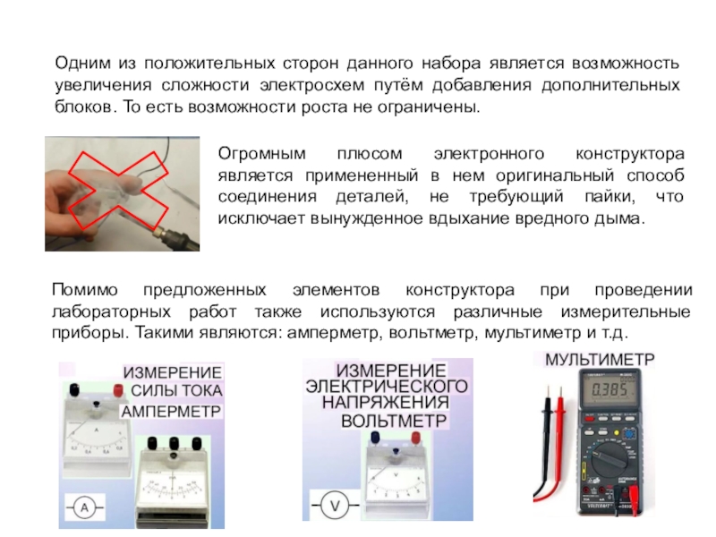 Использовать электронный конструктор можно в качестве наглядного пособия на практических занятиях по физике. Можно собрать множество различных электрических цепей и понять соответствующие им схемы. Лабораторные работы предназначены для углубления и закрепления теоретических знаний, а также приобретения навыков по сборке и наладке электрических схем, измерений в электрических цепях.