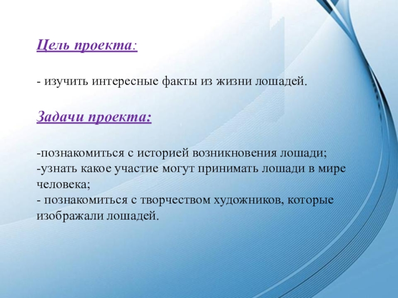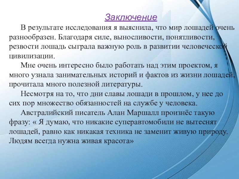 Мне очень интересно было работать над этим проектом, я много узнала занимательных историй и фактов из жизни лошадей, прочитала много полезной литературы.