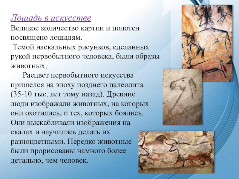 военных действий. Конь — один из первых объектов изобразительного творчества людей, запечатленный в наскальных рисунках, многочисленных изваяний.