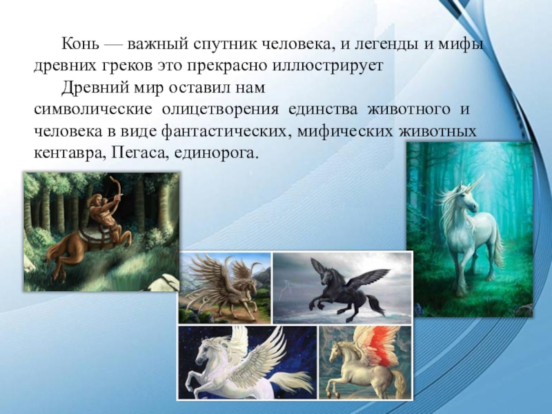 оставил нам символические олицетворения единства животного и человека в виде фантастических, мифических животных кентавра, Пегаса, единорога.