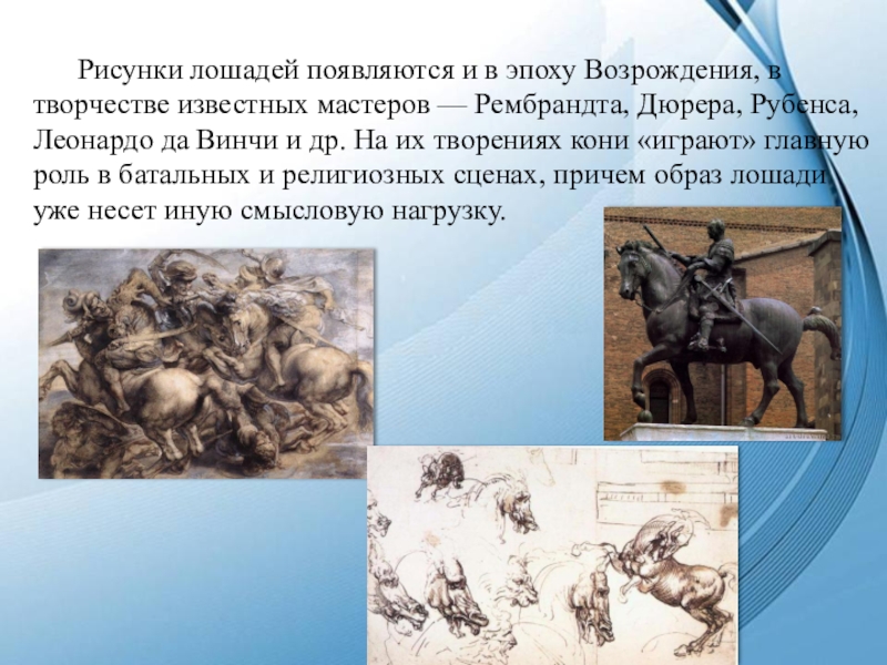 — Рембрандта, Дюрера, Рубенса, Леонардо да Винчи и др. На их творениях кони «играют» главную роль в батальных и религиозных сценах, причем образ лошади уже несет иную смысловую нагрузку.
