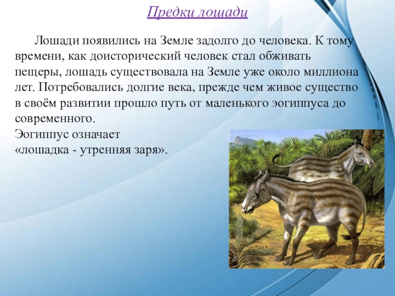 Слайд 5 Лошади появились на Земле задолго до человека. К тому времени, как