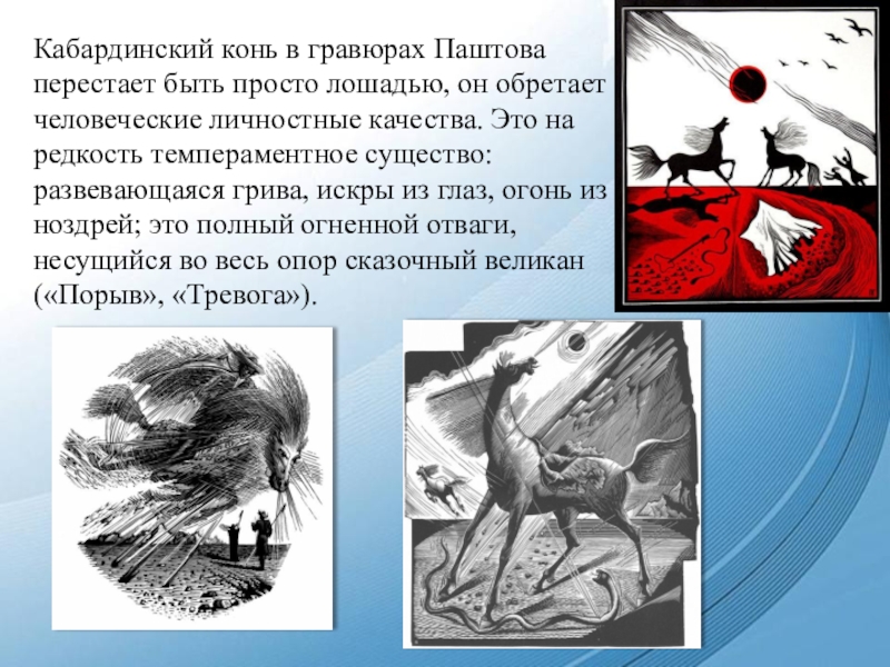 Слайд 27Кабардинский конь в гравюрах Паштова перестает быть просто лошадью, он обретает