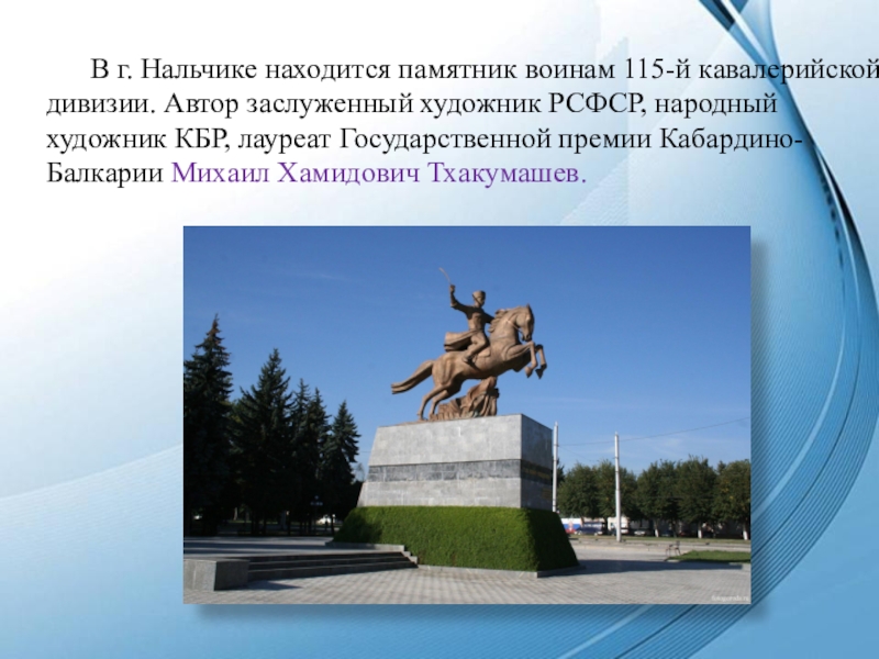 Слайд 30 В г. Нальчике находится памятник воинам 115-й кавалерийской дивизии. Автор заслуженный