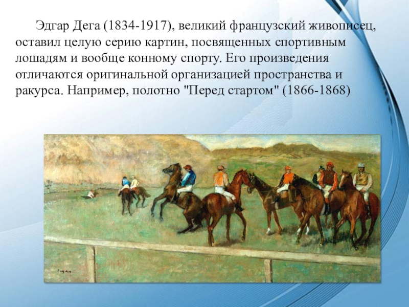 спортивным лошадям и вообще конному спорту. Его произведения отличаются оригинальной организацией пространства и ракурса. Например, полотно "Перед стартом" (1866-1868)