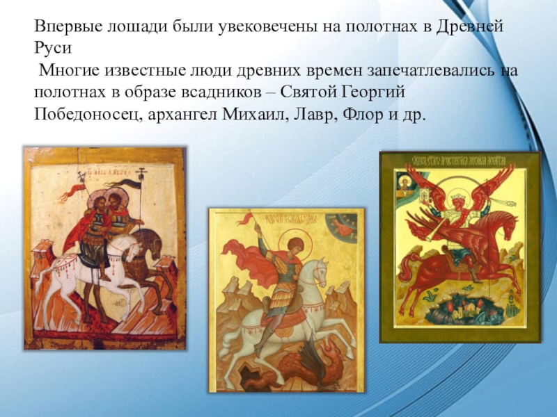 люди древних времен запечатлевались на полотнах в образе всадников – Святой Георгий Победоносец, архангел Михаил, Лавр, Флор и др.