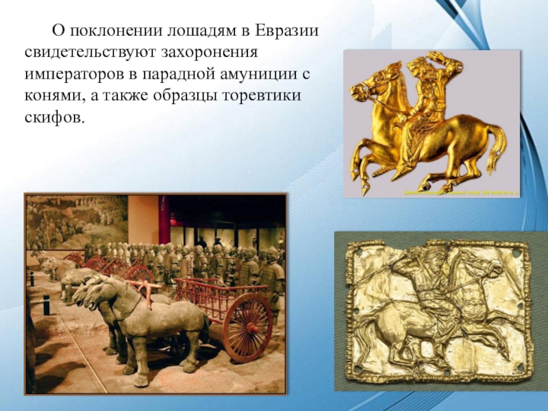 Слайд 15 О поклонении лошадям в Евразии свидетельствуют захоронения императоров в парадной амуниции