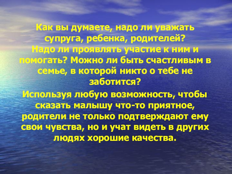 Слайд 3 Как вы думаете, надо ли уважать супруга, ребенка, родителей? Надо ли