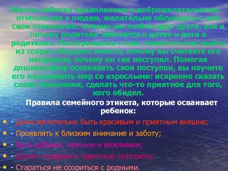 ним свои отношения: почему мы любим друг друга, как и почему родители заботятся о детях и дети о родителях. Поссорившись с ним, помогите ему выйти из ссоры: обсудите вместе, почему вы считаете его неправым, почему он так поступил. Помогая дошкольнику осознавать свои поступки, вы научите его налаживать мир со взрослыми: искренно сказать слова извинения, сделать что-то приятное для того, кого обидел.