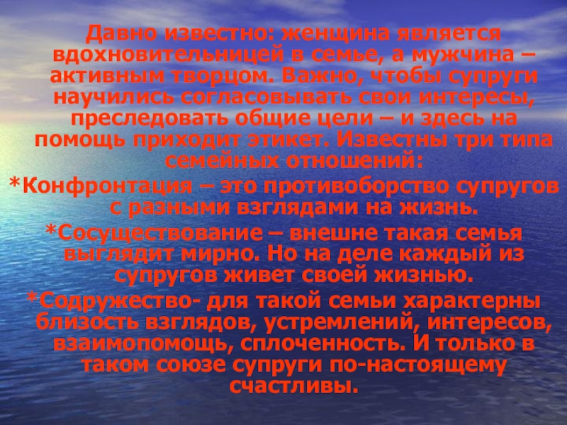 активным творцом. Важно, чтобы супруги научились согласовывать свои интересы, преследовать общие цели – и здесь на помощь приходит этикет. Известны три типа семейных отношений: