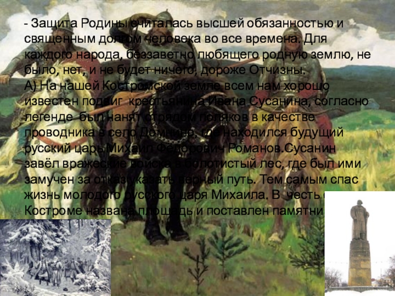 А) На нашей Костромской земле всем нам хорошо известен подвиг крестьянина Ивана Сусанина, согласно легенде был нанят отрядом поляков в качестве проводника в село Домнино, где находился будущий русский царь Михаил Фёдорович Романов.Сусанин завёл вражеские войска в болотистый лес, где был ими замучен за отказ указать верный путь. Тем самым спас жизнь молодого русского царя Михаила. В честь его в Костроме названа площадь и поставлен памятник.