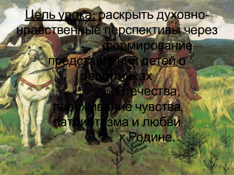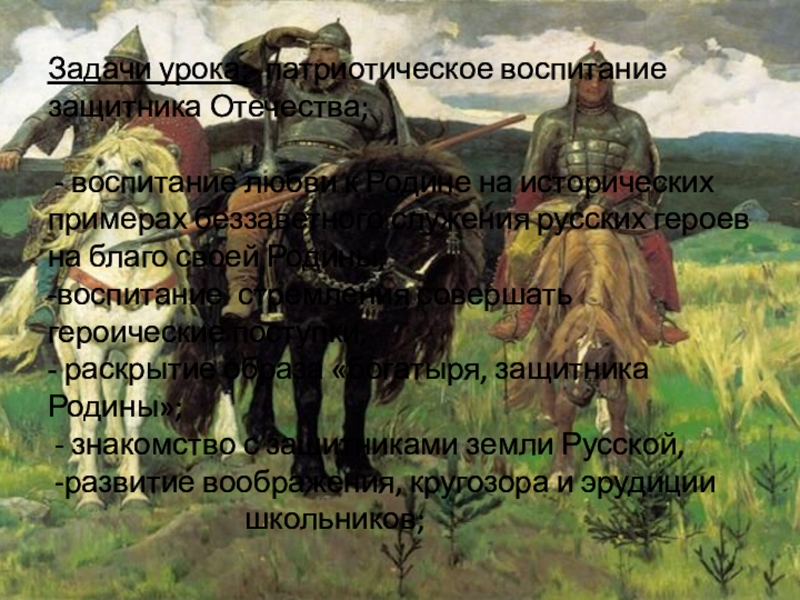 - раскрытие образа «богатыря, защитника Родины»;