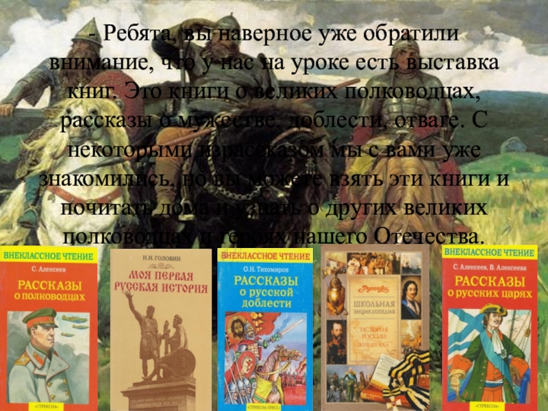 уроке есть выставка книг. Это книги о великих полководцах, рассказы о мужестве, доблести, отваге. С некоторыми израссказом мы с вами уже знакомились, но вы можете взять эти книги и почитать дома и узнать о других великих полководцах и героях нашего Отечества.