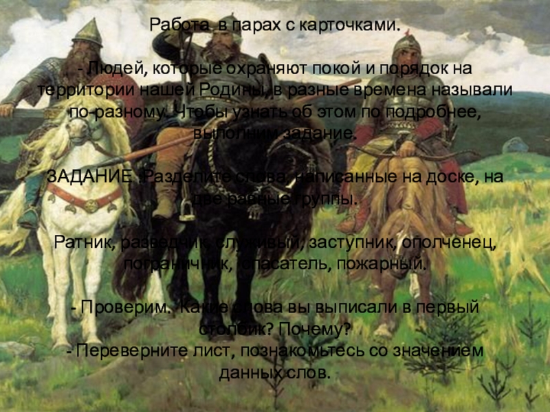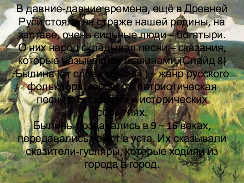 родины, на заставе, очень сильные люди – богатыри. О них народ складывал песни – сказания, которые называются былинами.(Слайд 8)