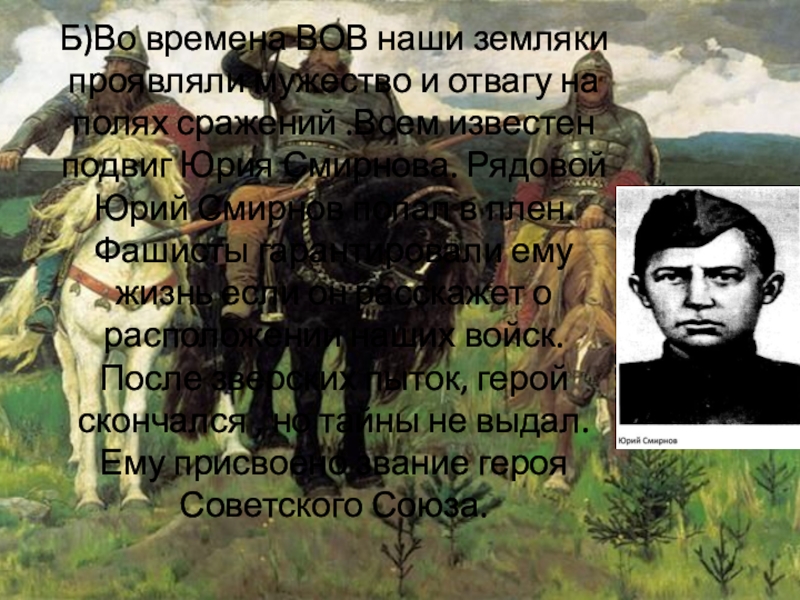 Слайд 11Б)Во времена ВОВ наши земляки проявляли мужество и отвагу на полях