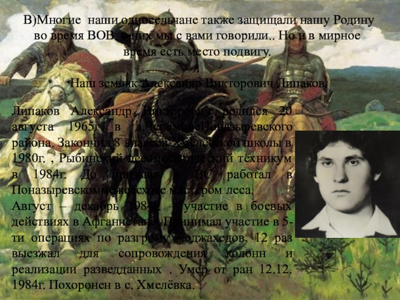 Слайд 12В)Многие наши односельчане также защищали нашу Родину во время ВОВ. о